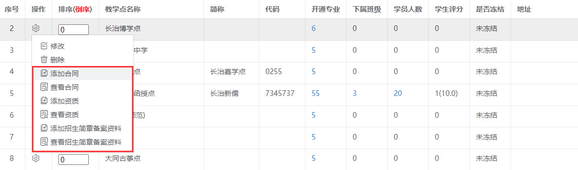 * 各个教学点增加了上传合同、资质、招生简章等资料的功能。如下图所示:
