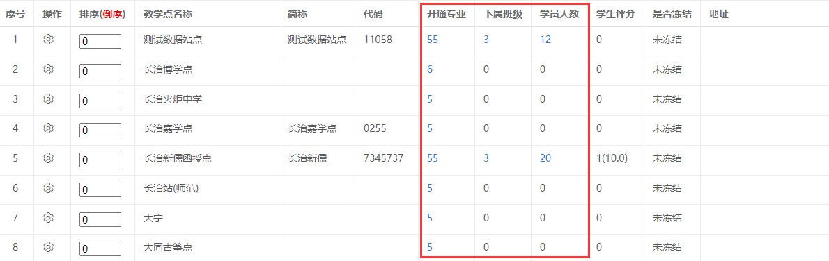* 教学点与专业绑定后,将显示开通的专业数、班级数和学员人数。如下图所示: