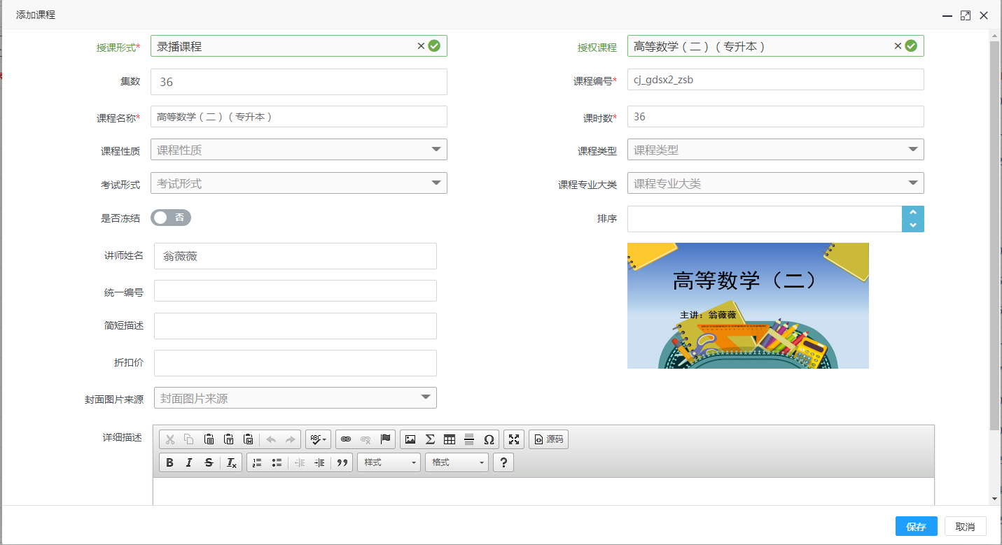 点击“添加”按钮,选择授课形式,如选择的是录播课程则会出现授权课程的选择,选择课程后课程中心里的课程信息会自动被读取过来。