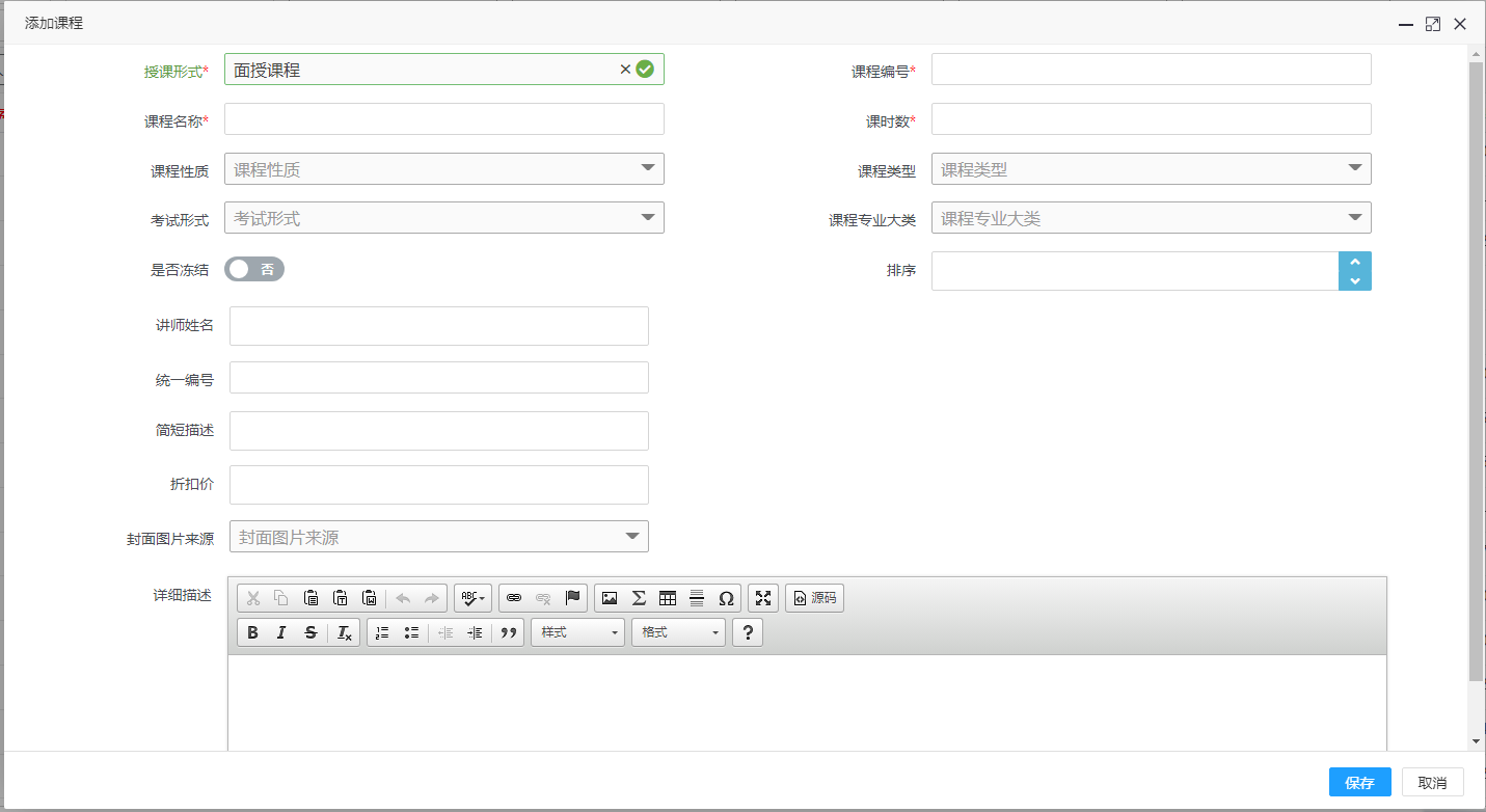 点击“添加”按钮,授课形式选择面授课程,填写相关的信息,其中带*为必填项,其他为选填,填写完成后点击保存即可。