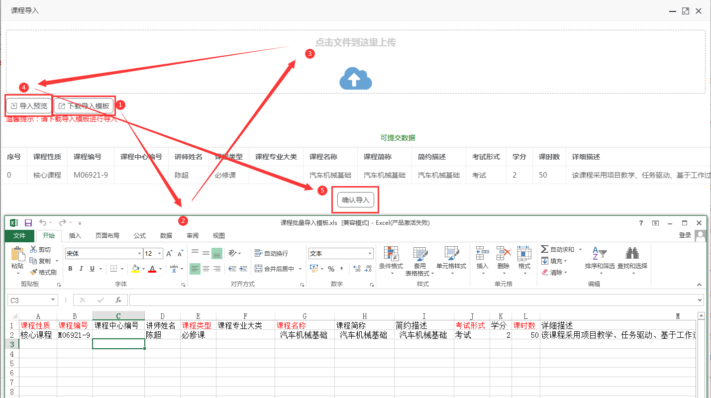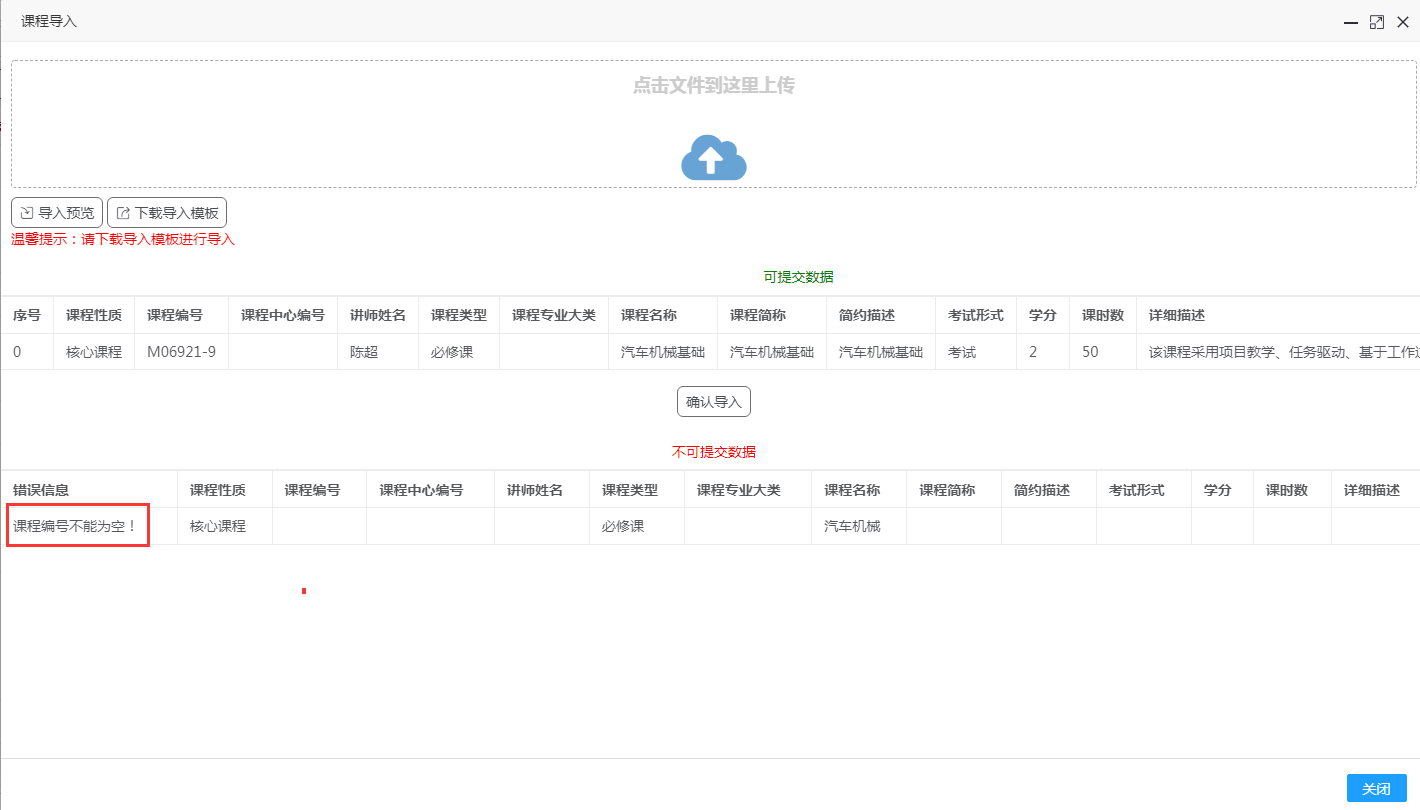 点击“课程导入”按钮,首先点击“下载导入模板”,再进行模板编辑,模板中红色列表名为必填项,其他为选填项,填写完成后点击保存,即为模板编辑完成,然后在上传框中点击选择编辑的模板,再点击“导入预览”,如模板中都为可提交数据则直接点击“确认导入”按钮即可。