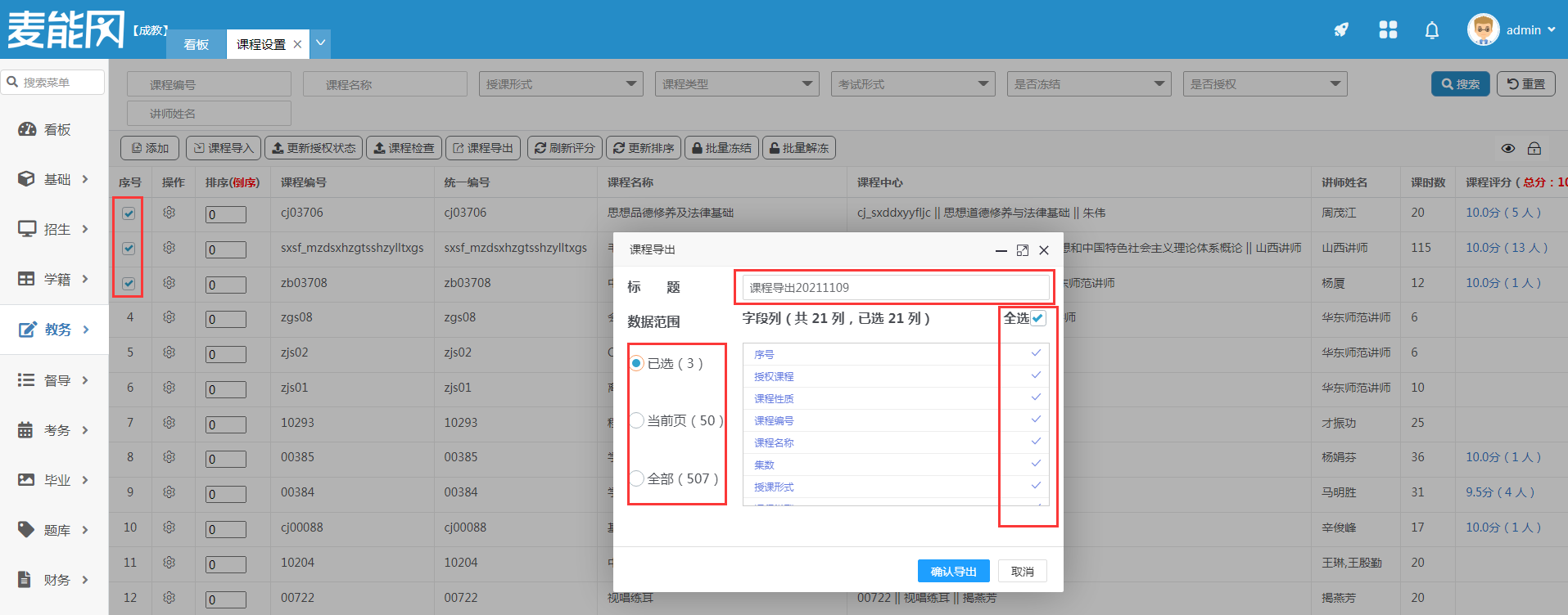 可勾选要导出的课程后点击“课程导出”按钮,也可以直接点击“课程导出”按钮选择当前页或者全部导出操作。导出字段默认为所有字段也可去掉勾选进行选择。