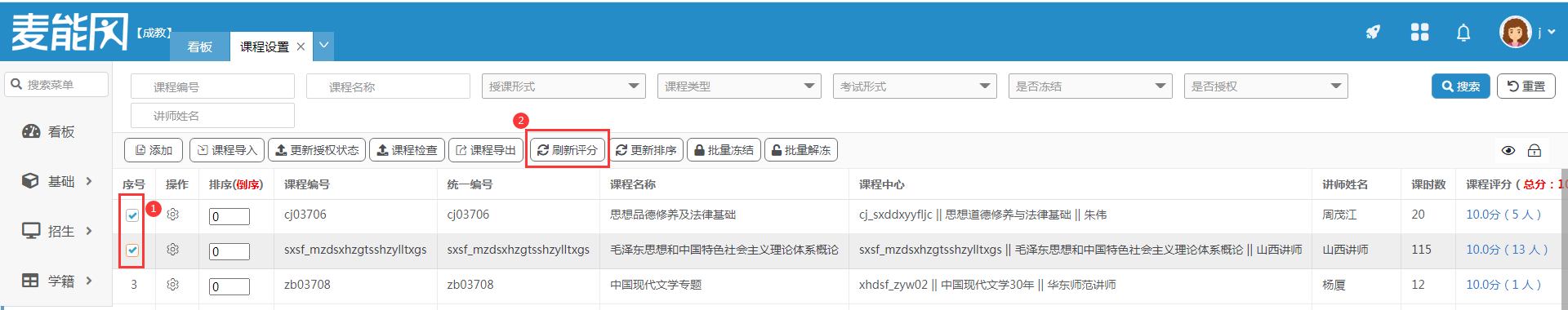 勾选课程后点击“刷新评分”按钮,即可同步课程评分,课程评分取学生评分的平均值。