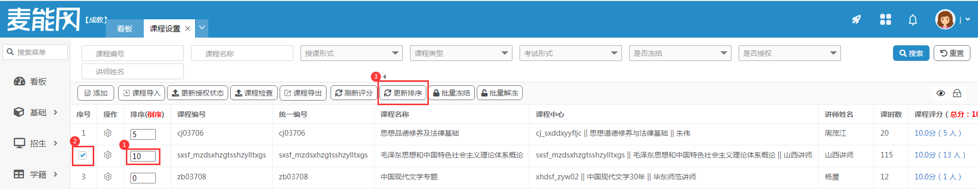 课程排序填写后,勾选该门课程点击“更新排序”按钮即可更新排序