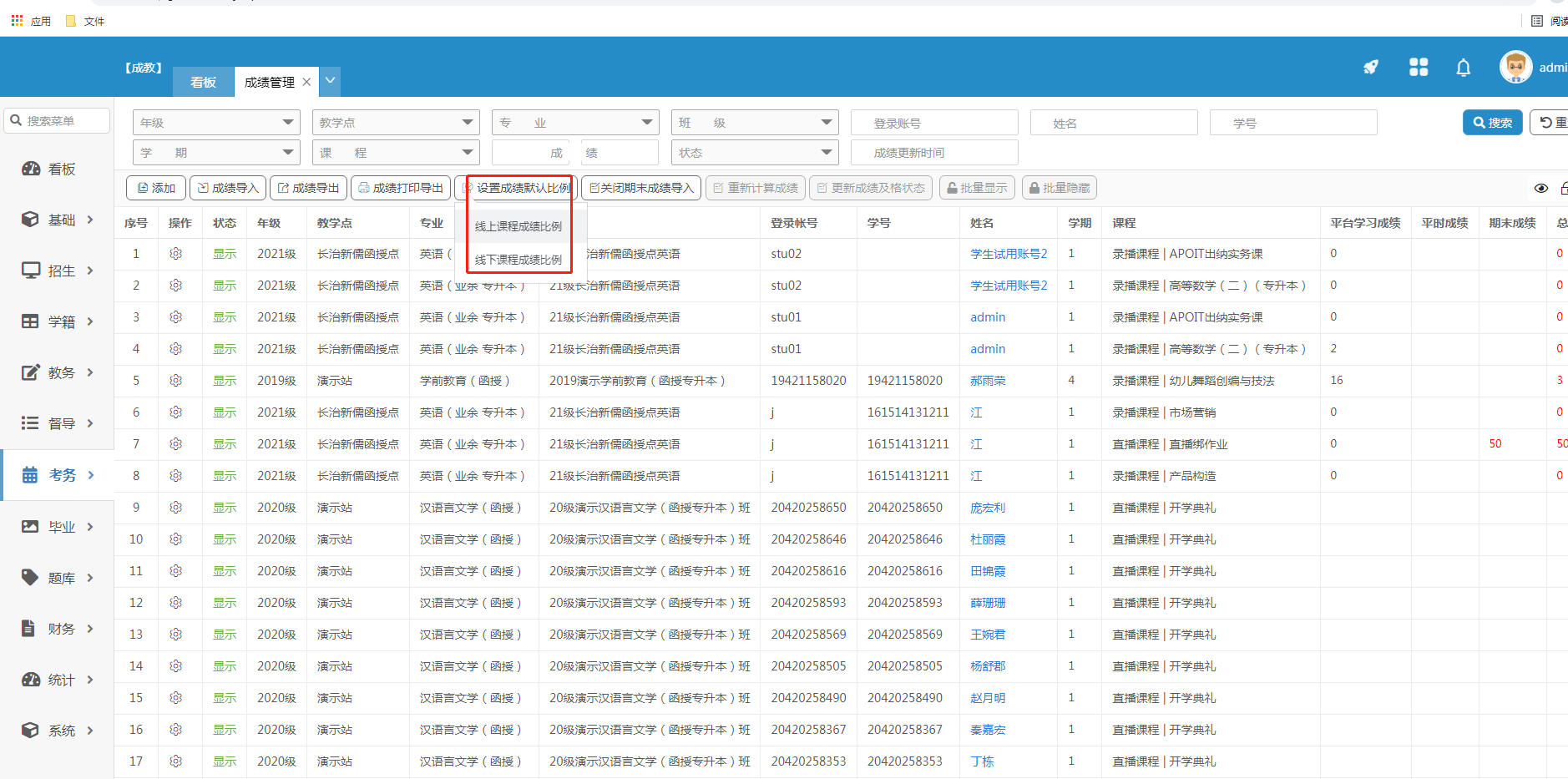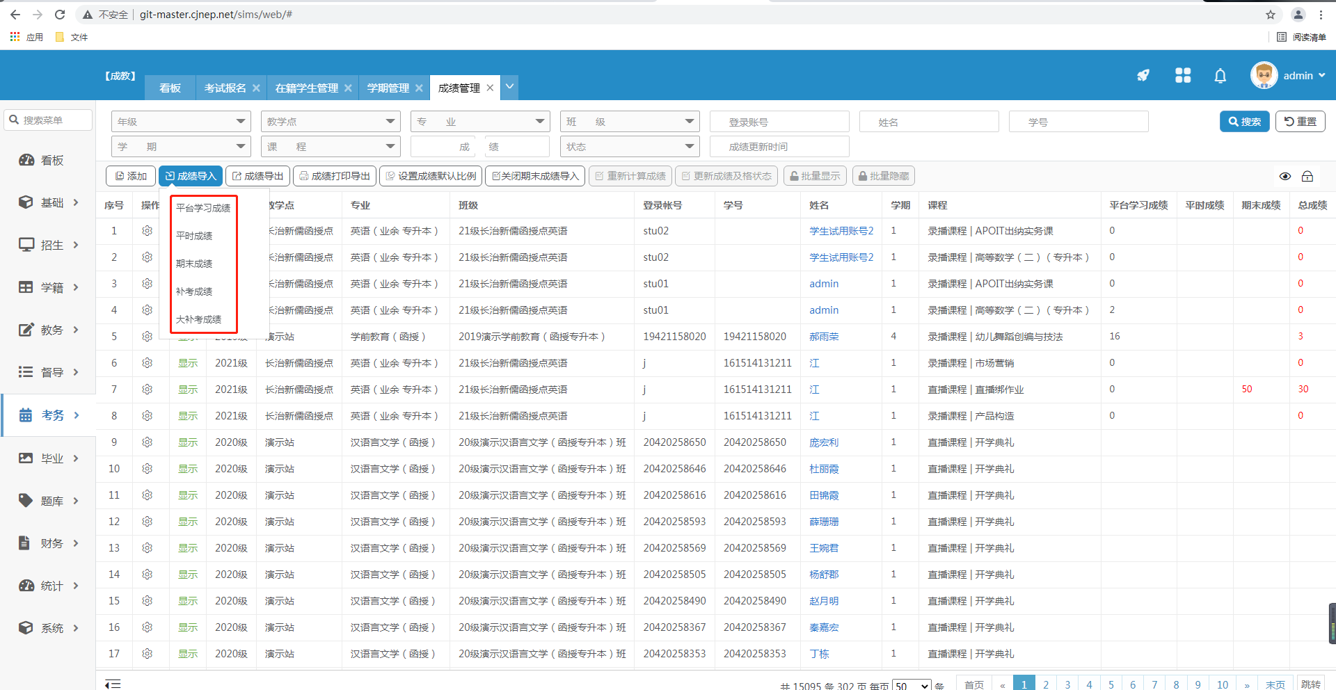 成绩管理是属于成绩汇总,可以导入平台学习成绩、平时成绩、期末成绩、补考成绩、大补考成绩,以及可以导出成绩。显示该学生是否及格以及各课程成绩。