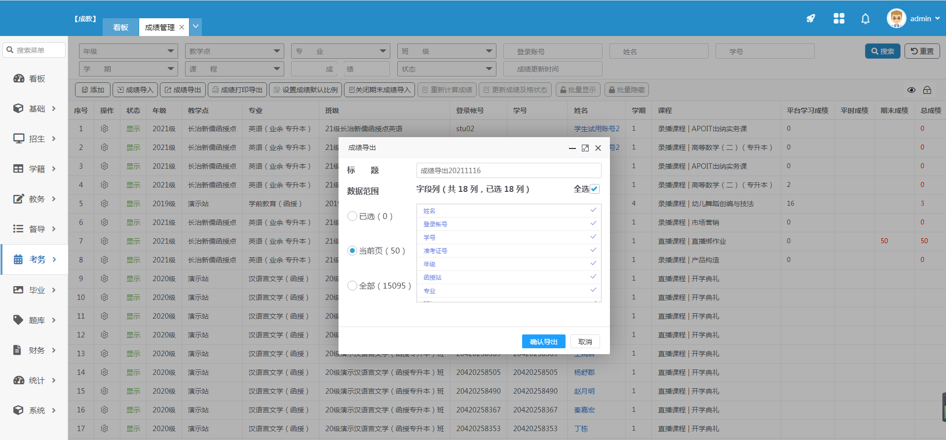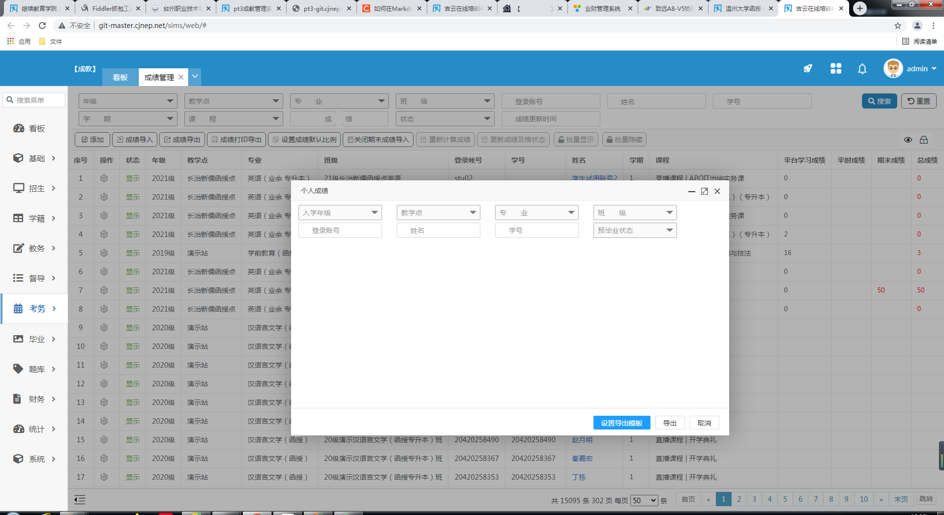 2.个人成绩导出 根据入学年级、教学点、专业、班级等进行导出,也可更换导出的模板