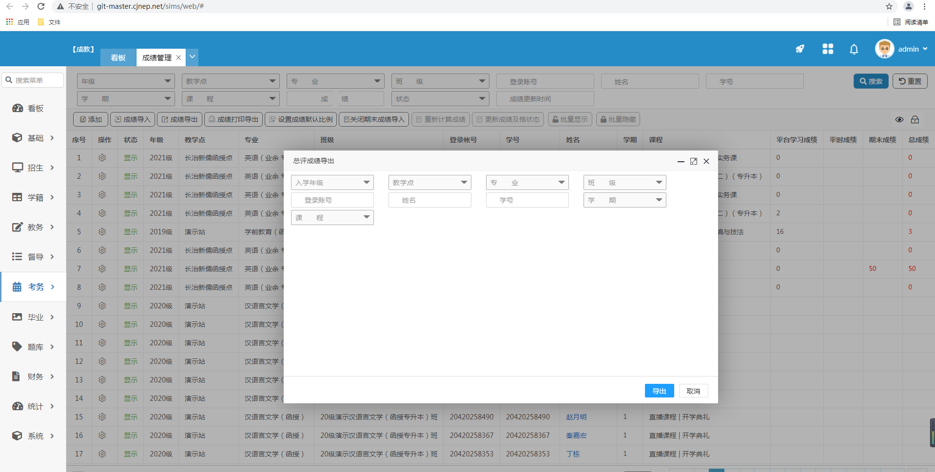 3.总成绩导出 根据入学年级、教学点、专业、班级等进行导出,