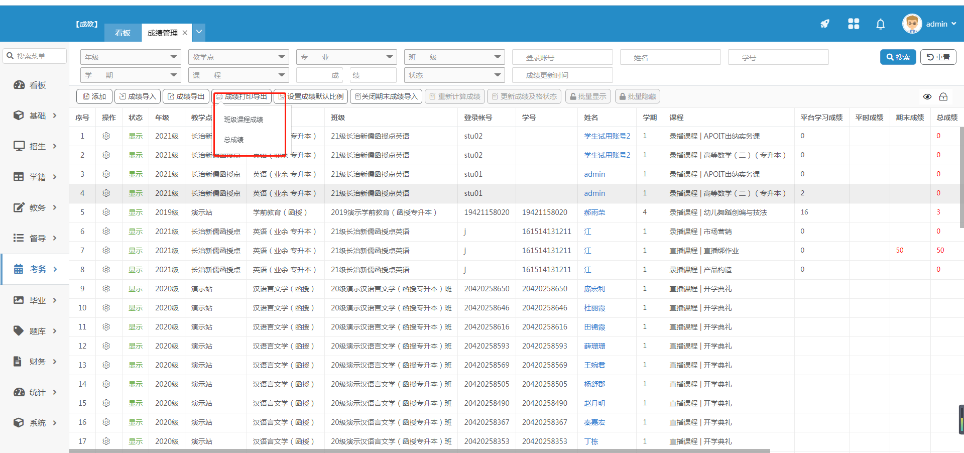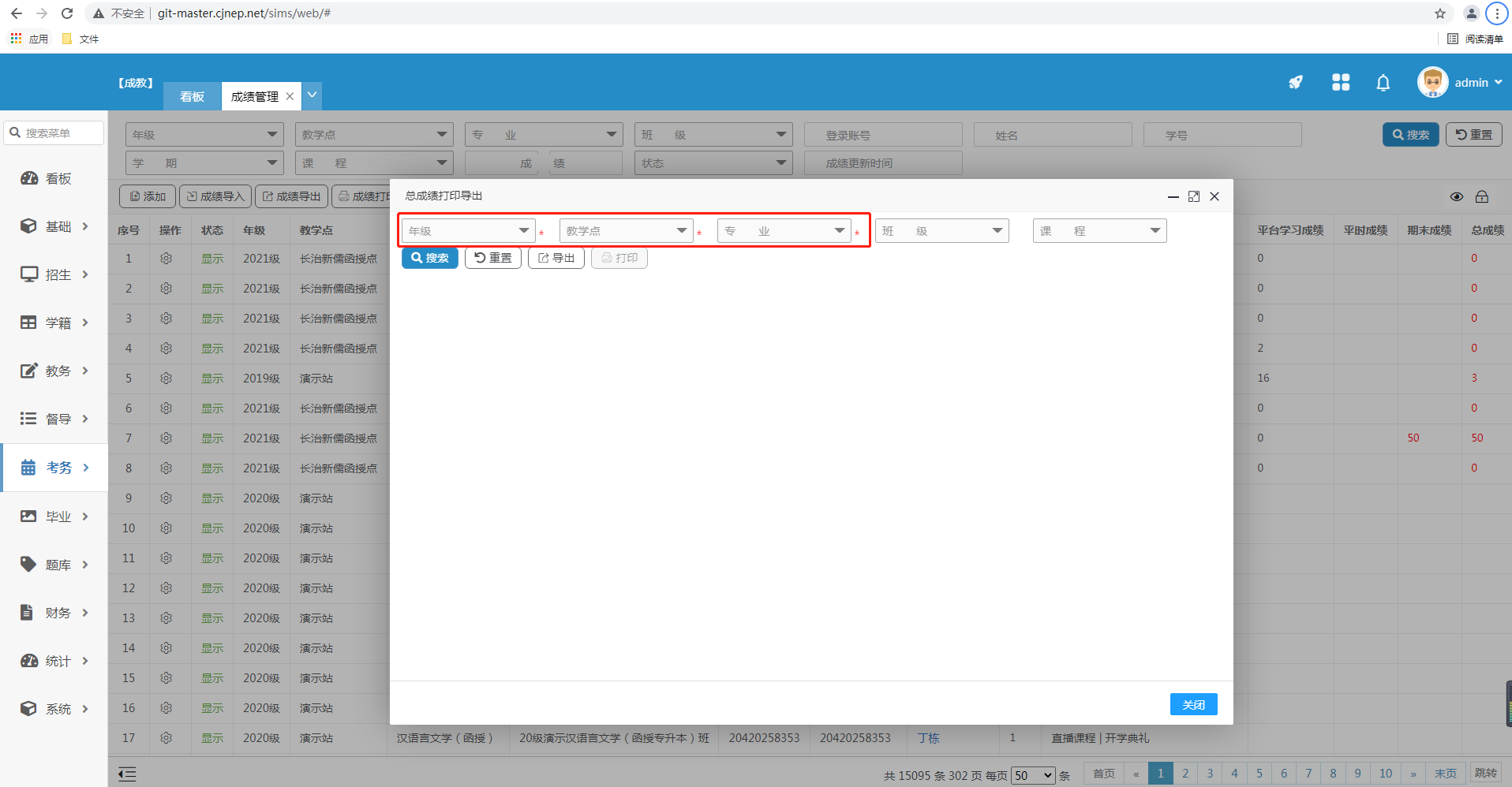 2.总成绩 根据年级、教学点、专业进行导出或打印