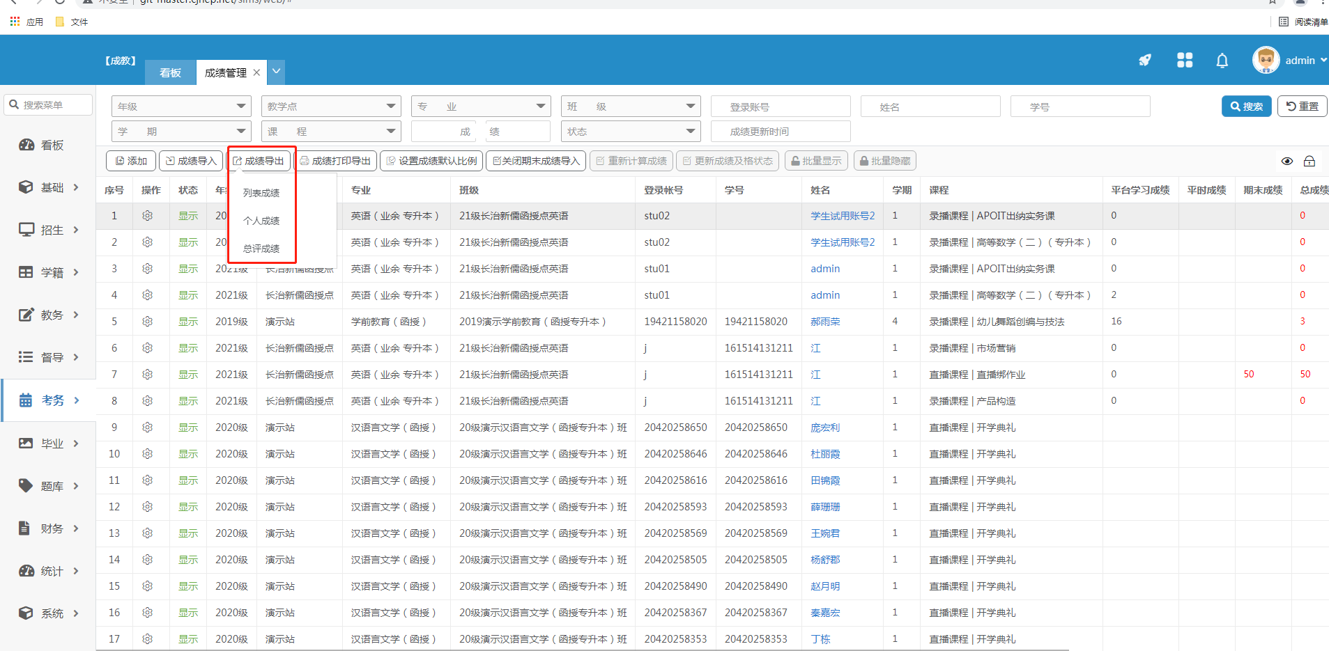 3.成绩导出 选择不同的成绩导出