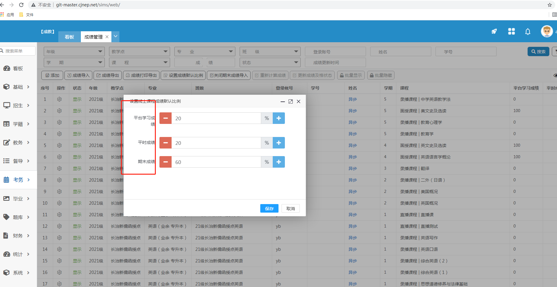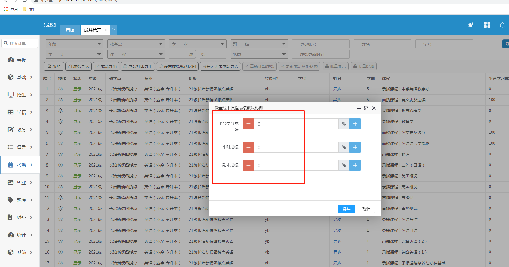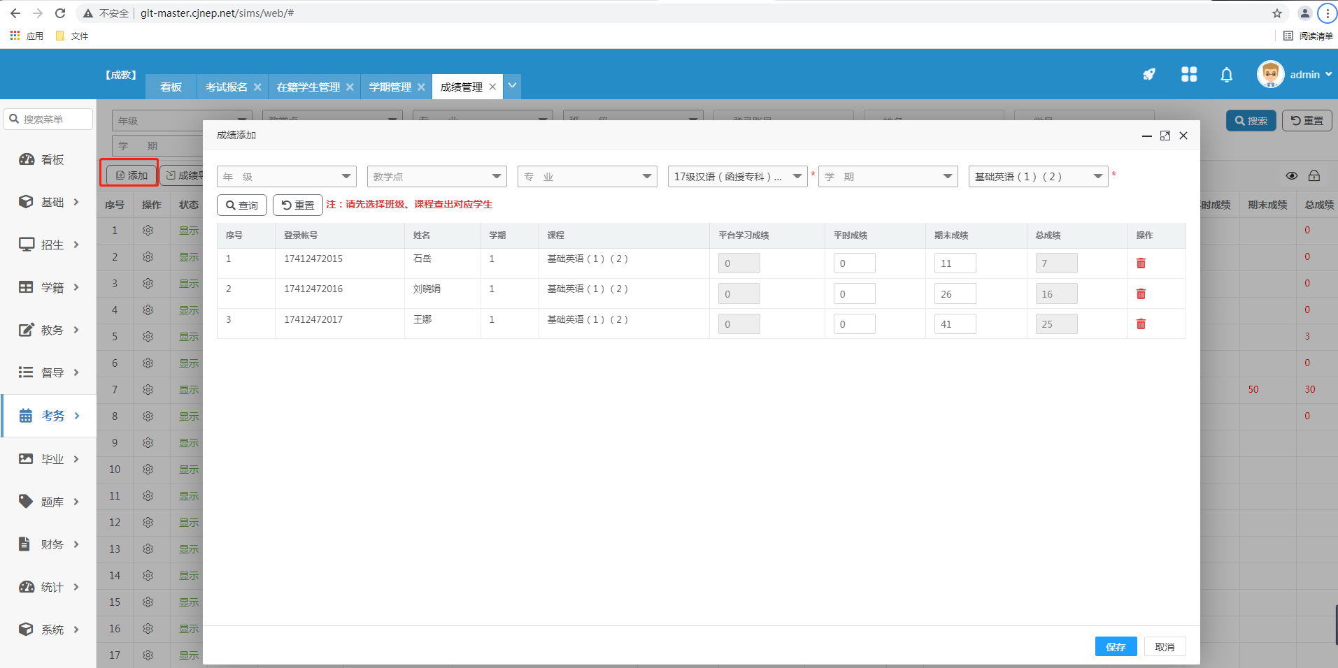 1.添加,选择班级、课程查出对应的学生填写平时成绩及期末成绩,根据比例算出总成绩