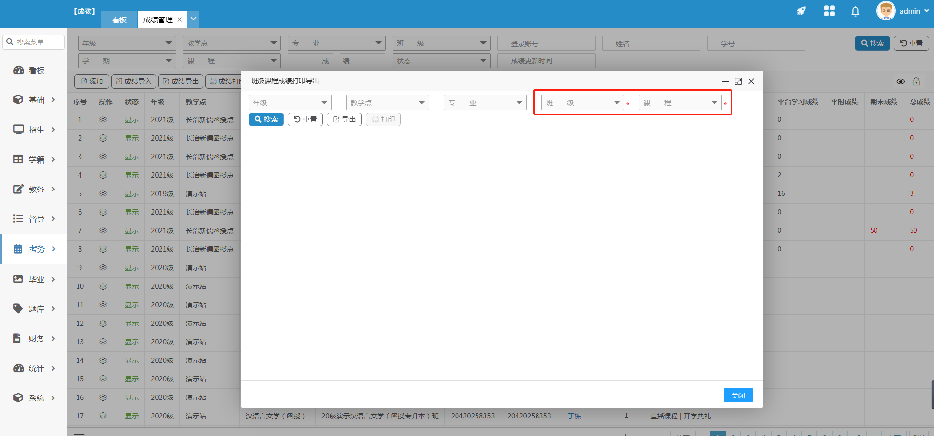 1.班级课程成绩 根据专业、课程进行导出或打印