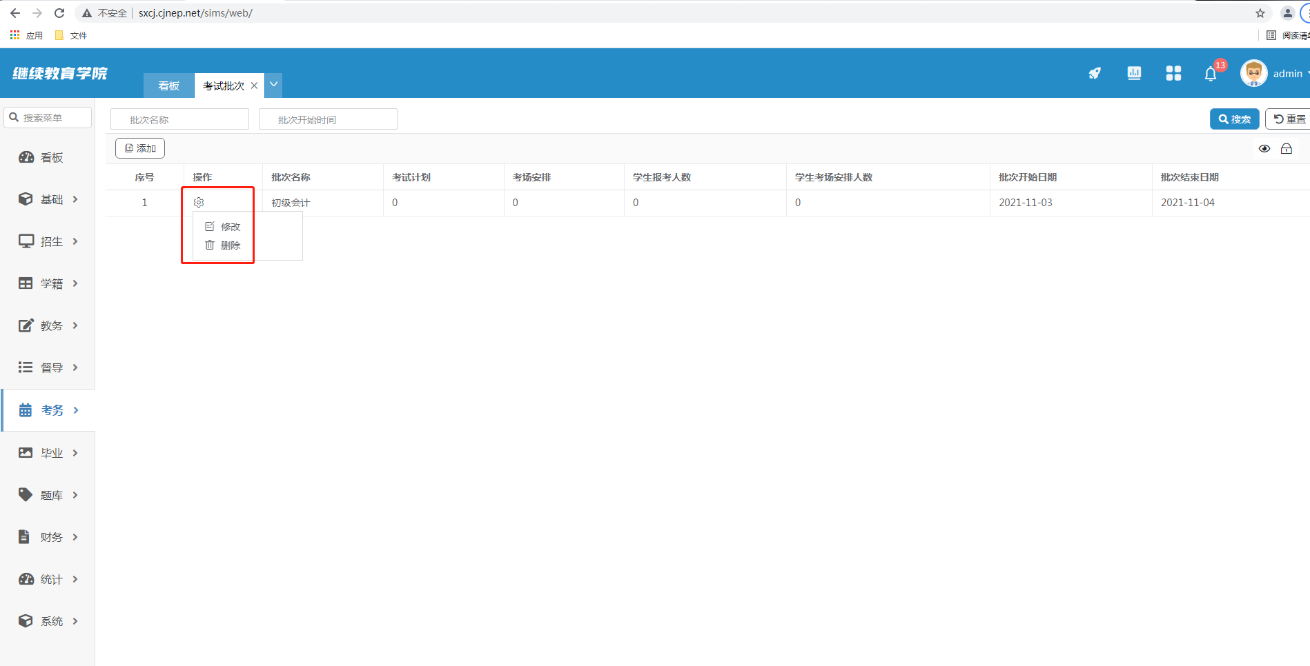 可以进行修改删除某条考试批次,输入批次名称或批次开始时间点击查询显示该考试批次