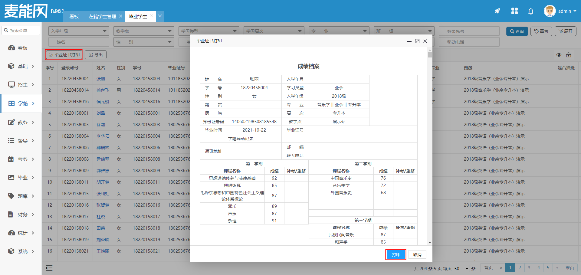 点击按钮“毕业证书打印”,弹框内将会显示所有已毕业学生的毕业证书列表,可拖动鼠标查看,点击打印则进入正常打印程序。