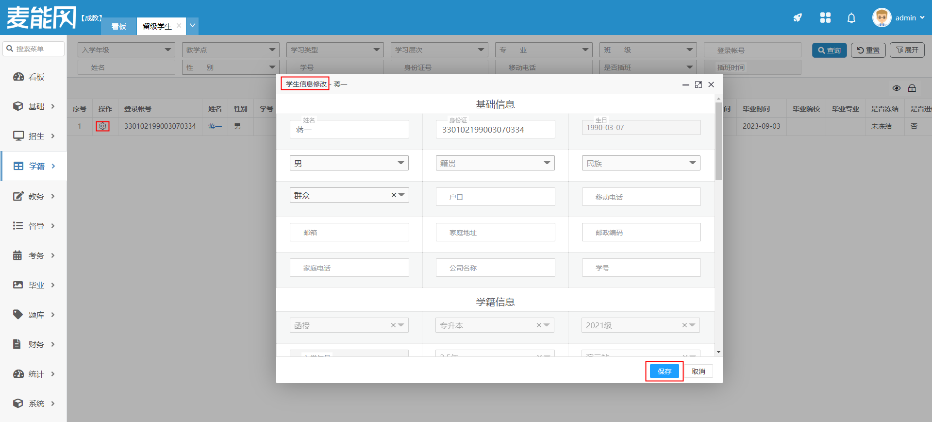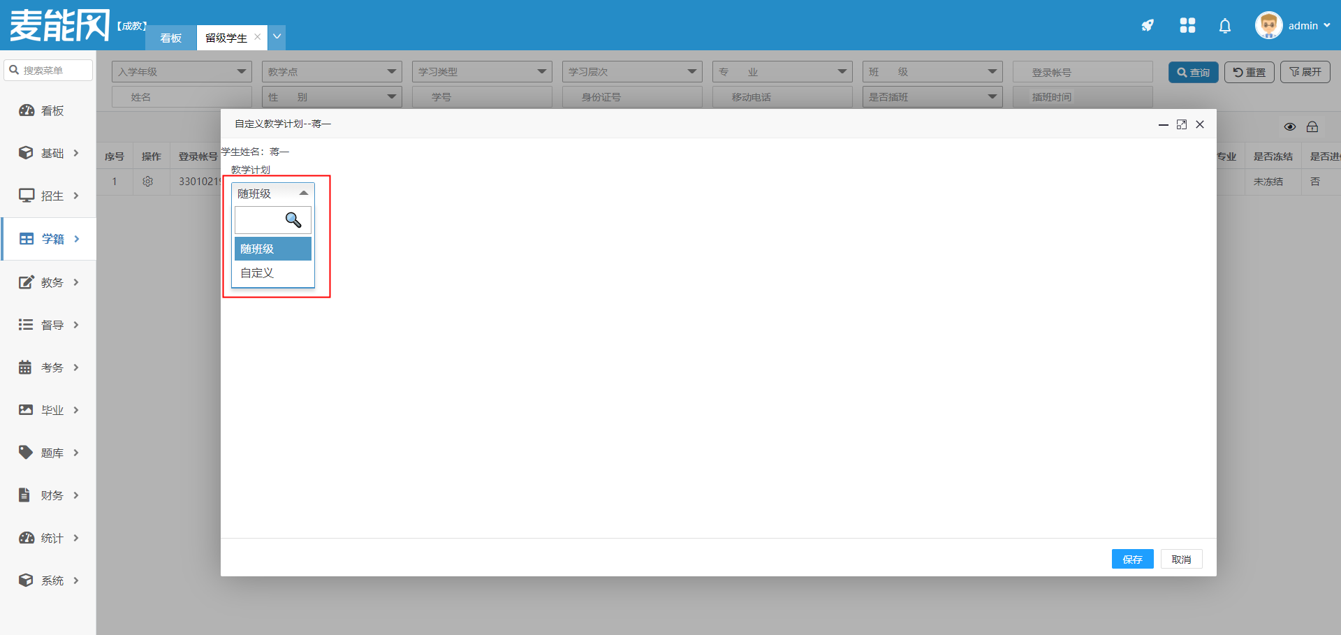该模块存储留级学生数据。数据来源于学籍-学生管理-在籍学生管理内留级的操作。在此页面,可以查看、修改、删除学生信息,自定义教学计划,冻结和模拟登录学生账号。