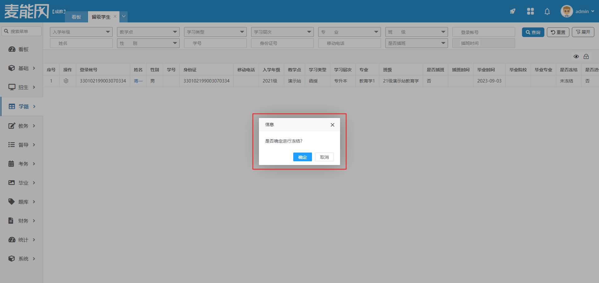 在操作项点击冻结,弹出确认框,点击确定则该学生账号被冻结,无法登录。点击取消则冻结失败。