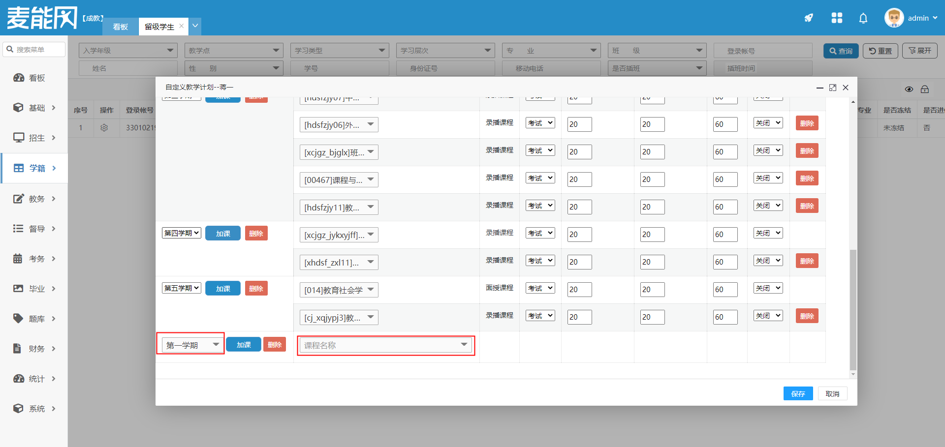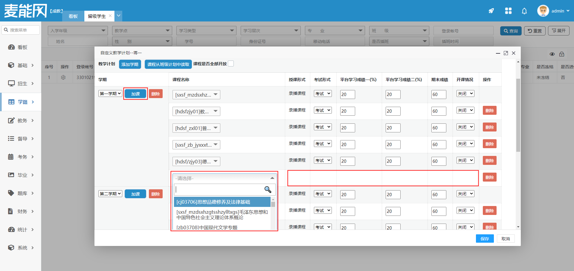 点击加课,则在该学期内新增课程,可以在下拉框内选择要加的课程。选好后会自动填充该课程的授课形式,考试形式,平台学习成绩一(%),平台学习成绩二(%),期末成绩和开课情况,填充后可以根据实际情况进行修改(除授课形式)。
