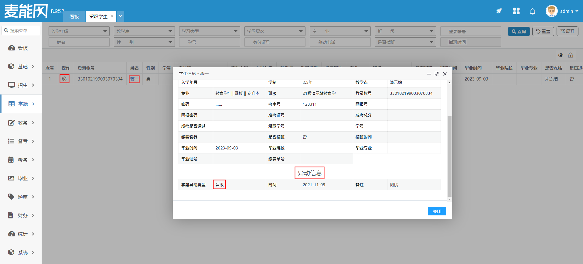 点击学生姓名或在操作项点击查看,弹框内显示学生的基础信息,学籍信息和其他信息。在学籍信息下方可以查看异动信息。