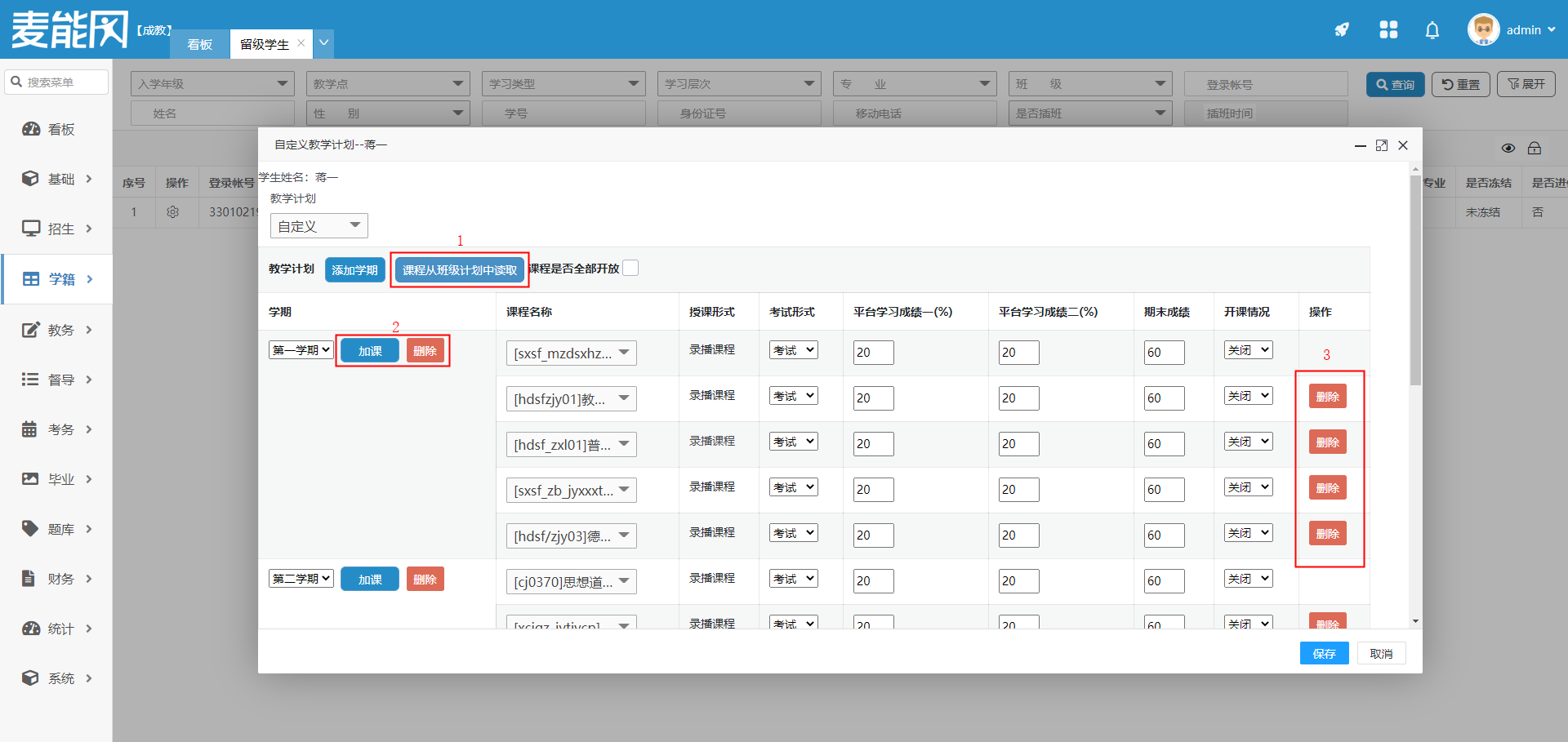 点击图中课程从班级计划中读取(红框1),则会自动读取该学生所在班级的课程。可以在此基础上进行加课和删除课程的操作。