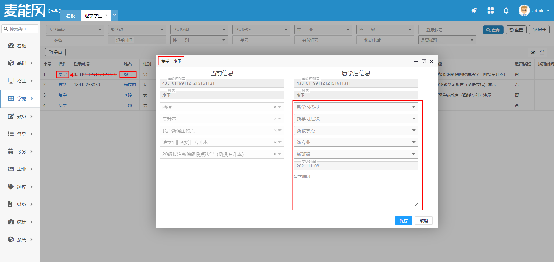点击对应学生的复学操作,在弹框内右侧复学后信息框选择正确的内容,保存则复学成功。则该学生数据从退学学生库里面消失。