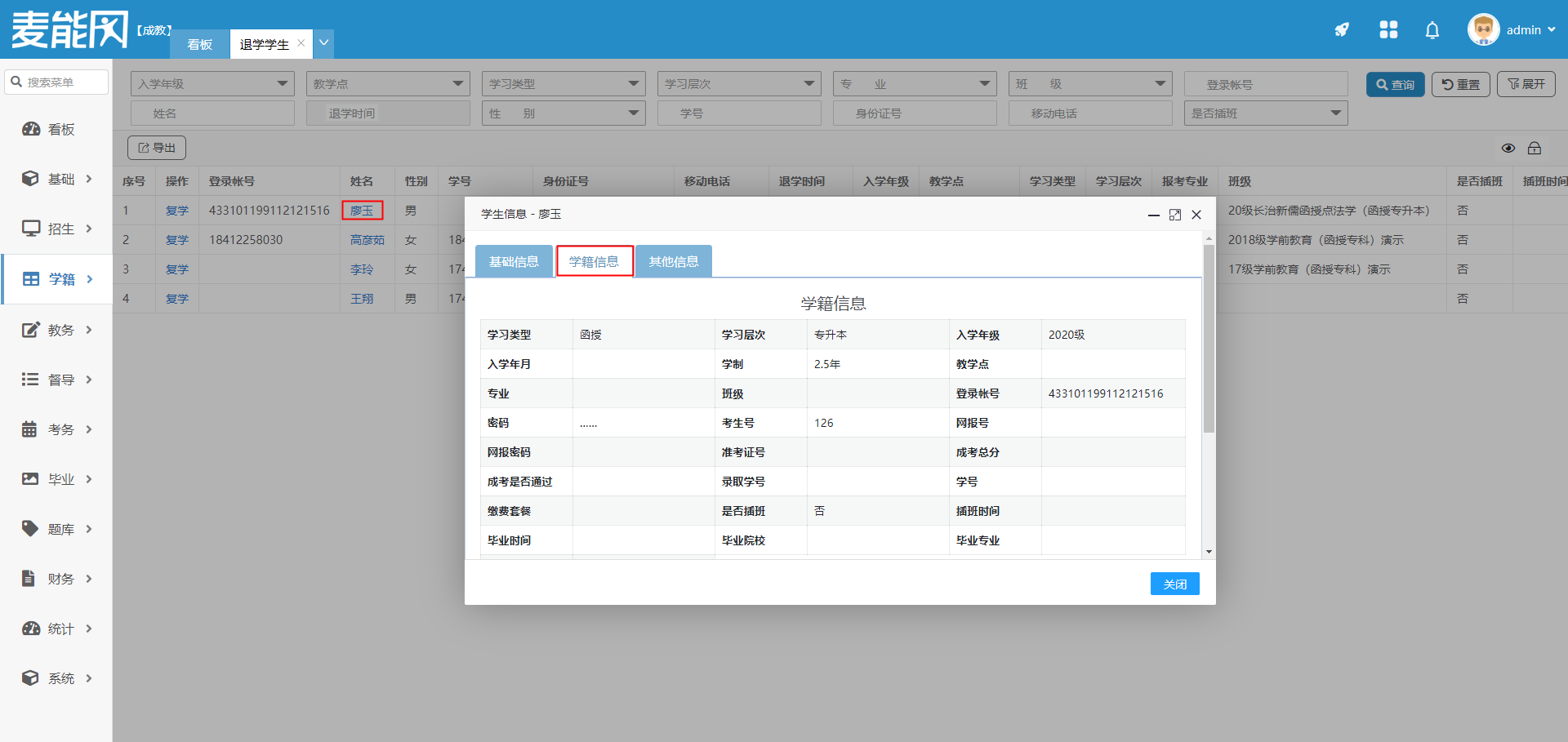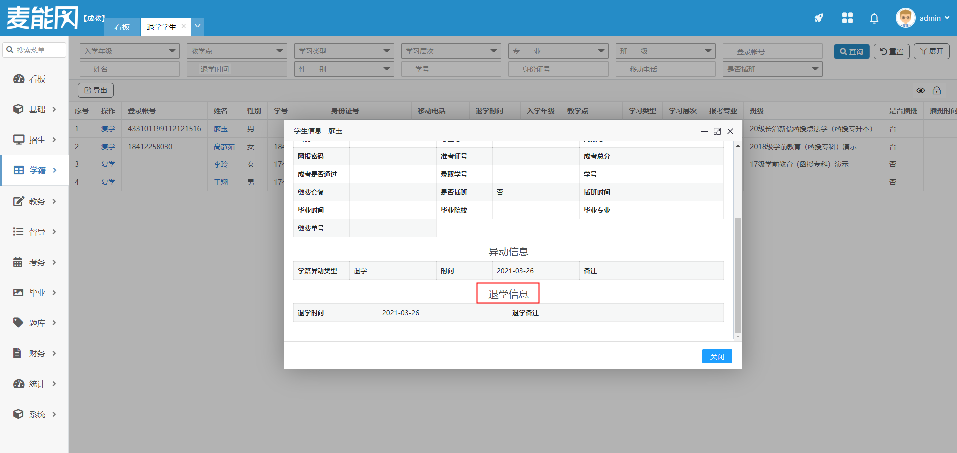 点击学生姓名,在弹框内点击学籍信息,鼠标下滑,显示退学信息。