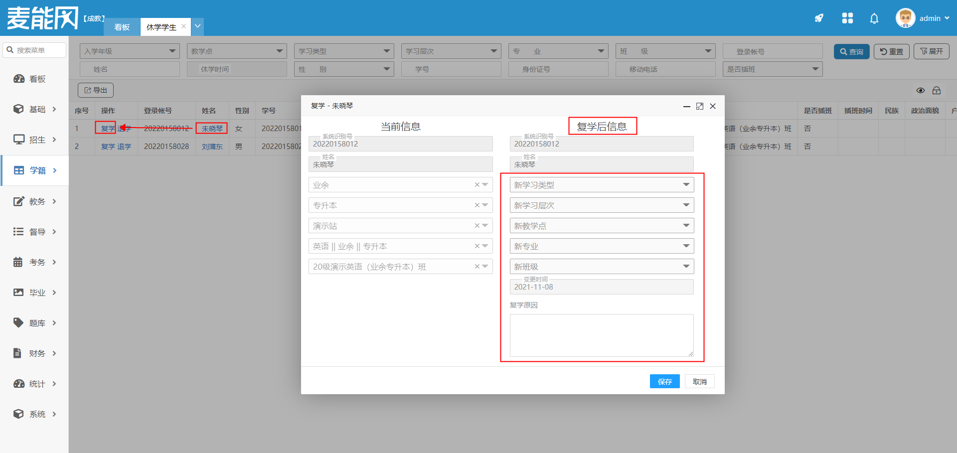 点击对应学生的复学操作,在弹框内右侧复学后信息框选择正确的内容,保存则复学成功。则该学生数据从休学学生库里面消失。