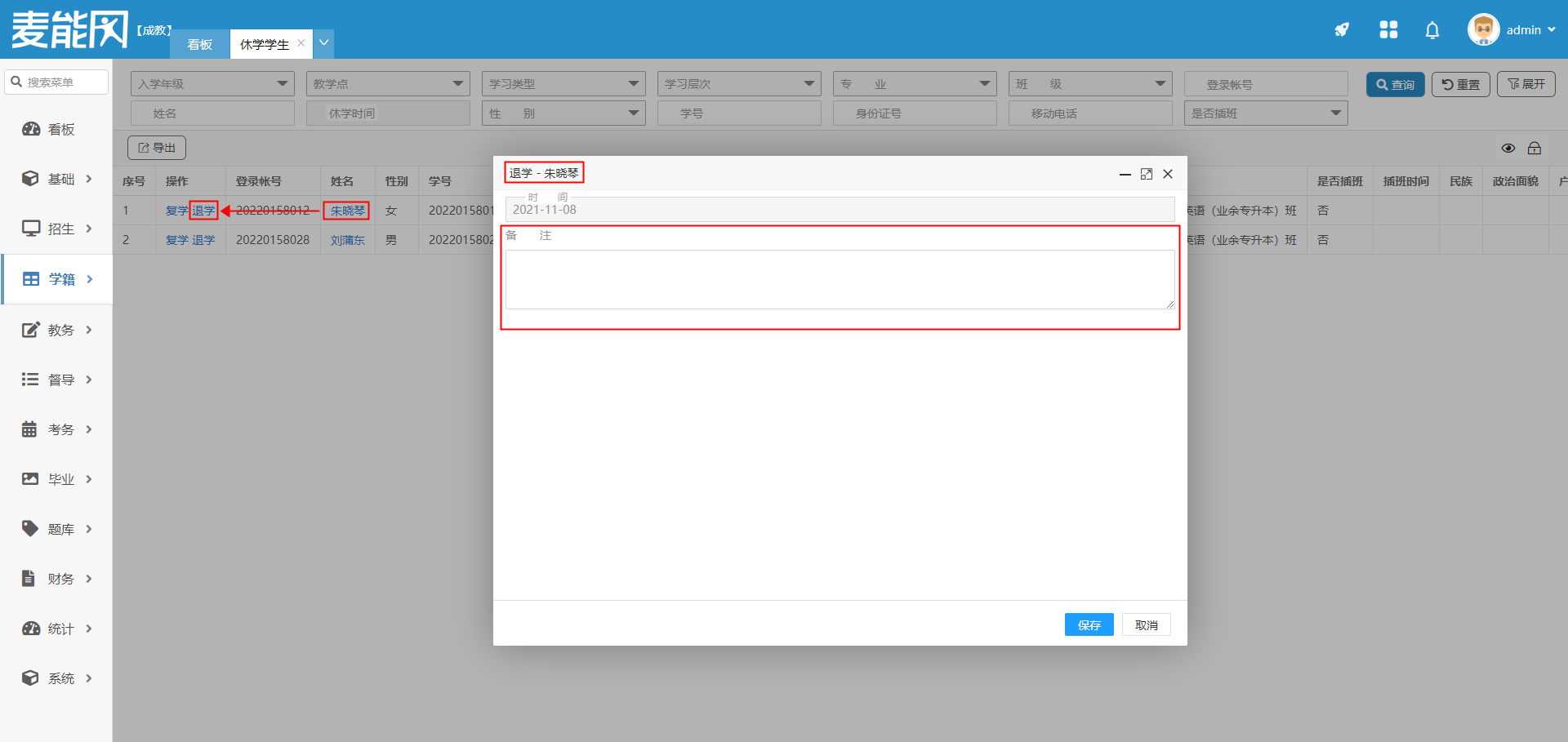点击对应学生的退学操作,在弹框内输入备注,点击保存,则操作成功。