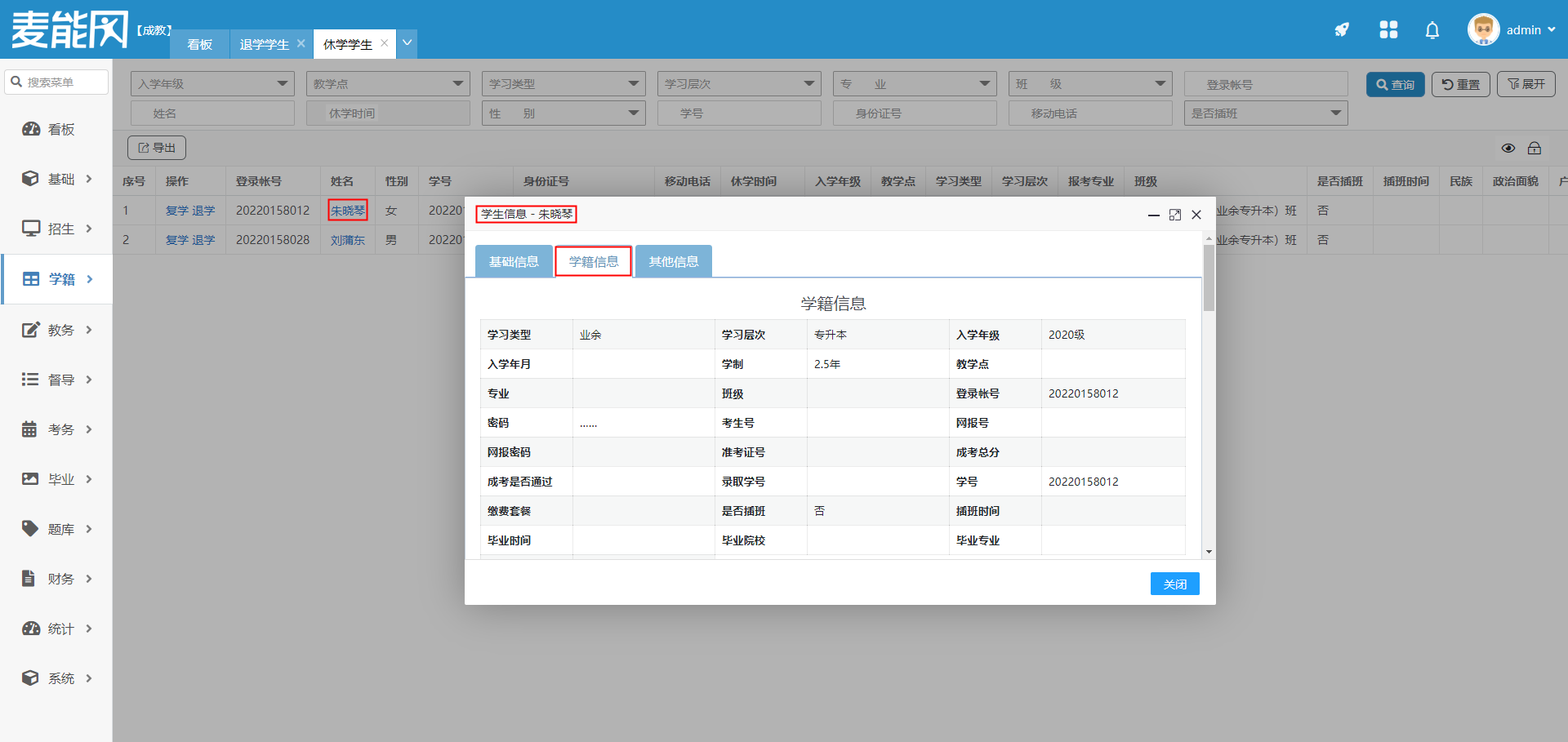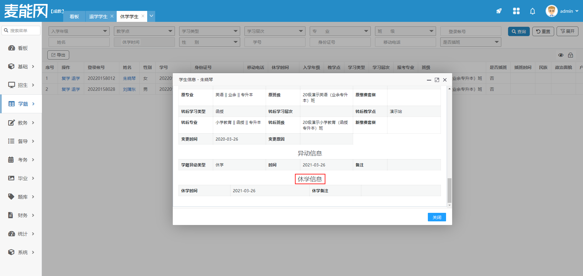 点击学生姓名,在弹框内点击学籍信息,鼠标下滑,显示休学信息。